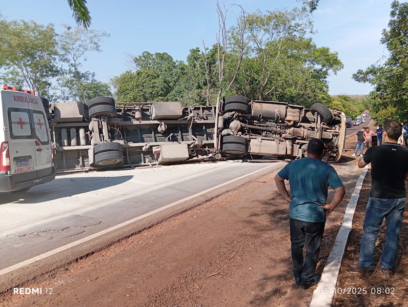 Uma carreta tombou na manhã desta quarta-feira (15) na BR-262, entre os municípios de Aquidauana e Campo Grande. Apesar do susto, ninguém ficou gravemente ferido.