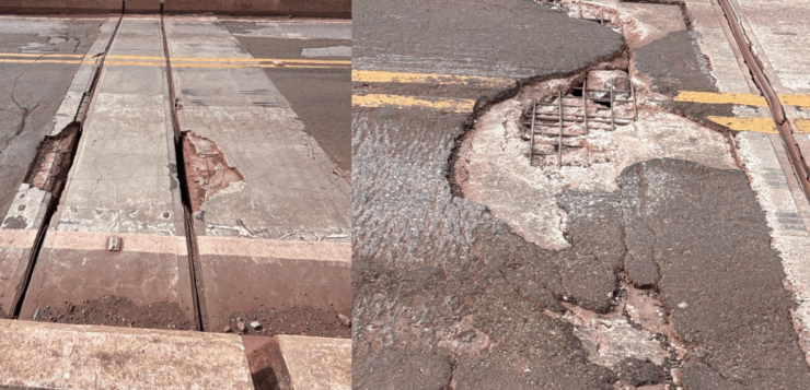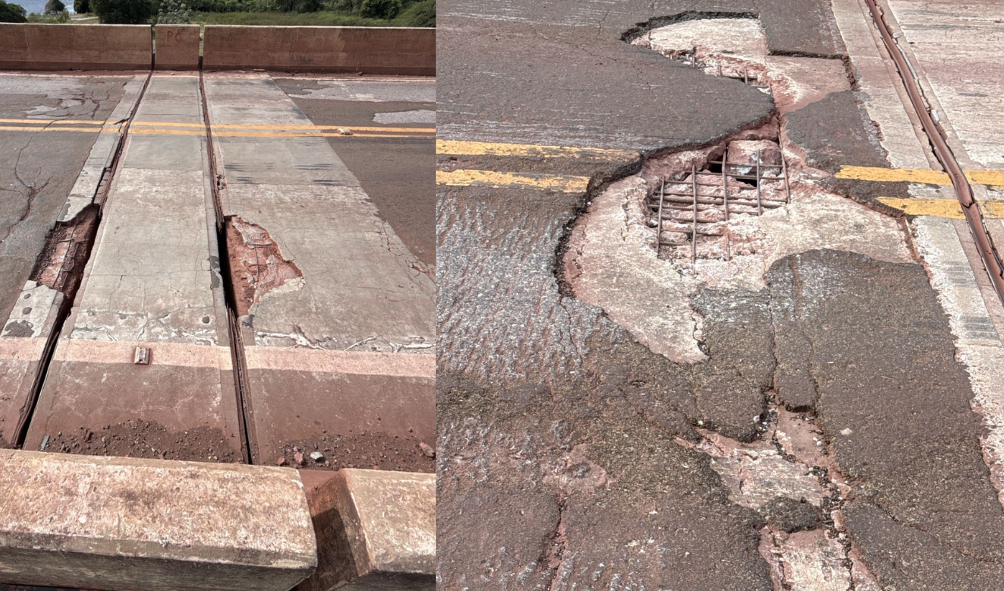 Atenção redobrada é crucial neste momento devido à presença de um grande buraco com exposição de vergalhões na pista da ponte. Este defeito representa um sério risco de acidentes graves e estouro de pneus.