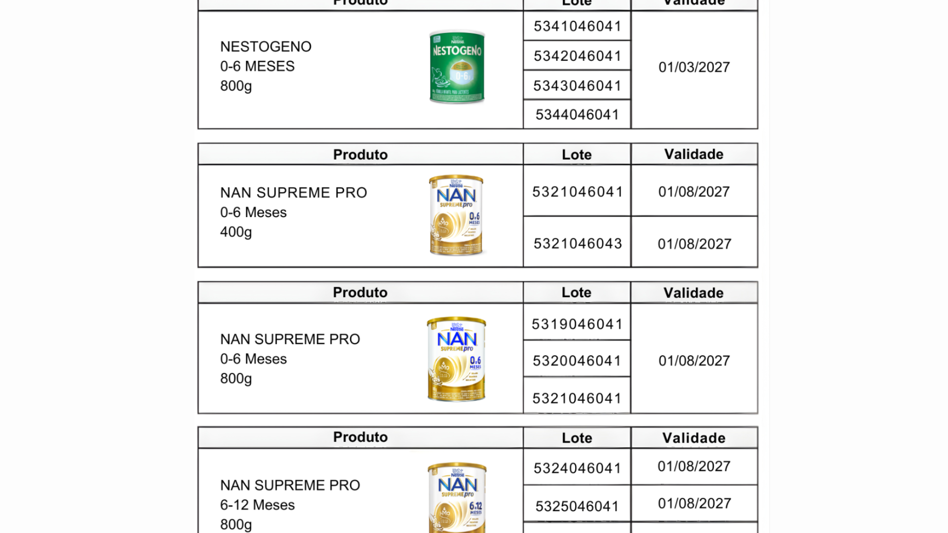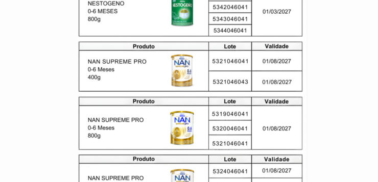 | Nestogeno 1 e 2 | 4325, 4326 e 4327 | Out/2026 a Jan/2027 |