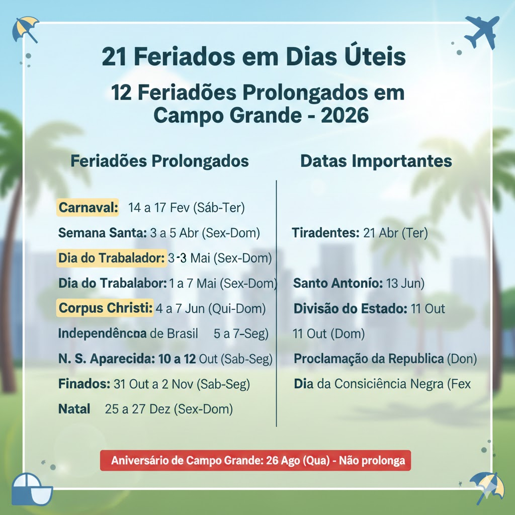 Vale lembrar que o aniversário de Campo Grande, em 26 de agosto, cairá em uma quarta-feira, sendo o único feriado que ficará isolado no meio da semana sem previsão de emenda oficial.