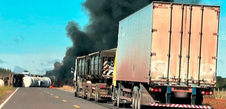 Carreta-tanque tomba, pega fogo e interdita totalmente a MS-040 em Campo Grande