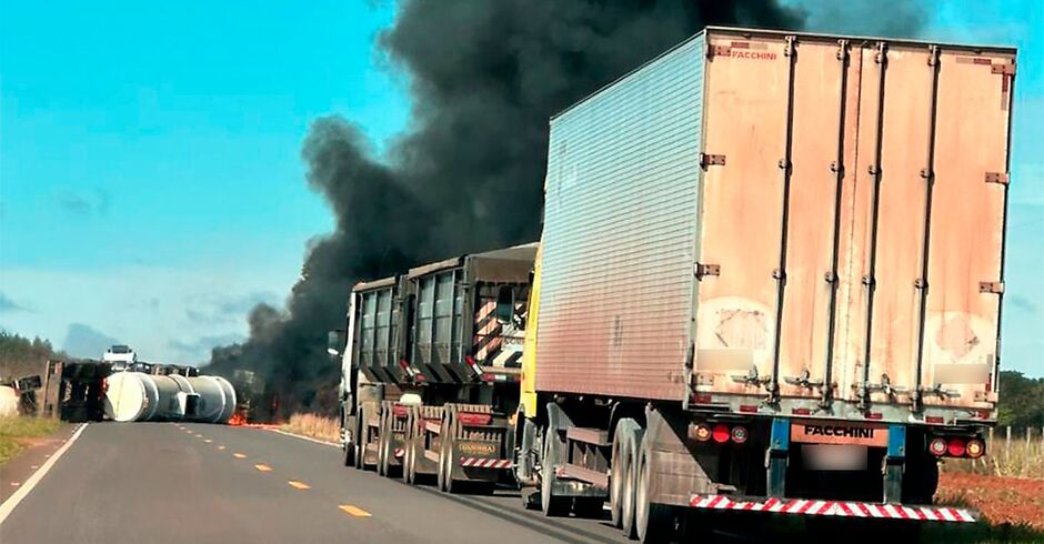 Uma carreta-tanque tombou e interditou completamente a MS-040 no km 62, em Campo Grande, na manhã desta quinta-feira (27). O veículo, ao cair sobre a pista, provocou um incêndio às margens da rodovia, conforme imagens registradas no local.