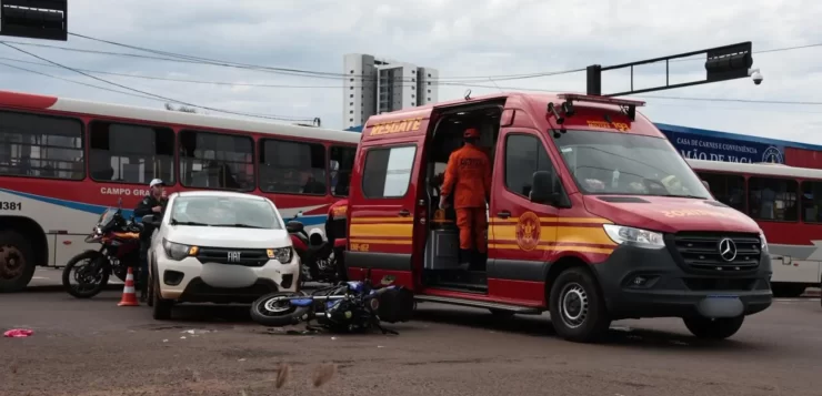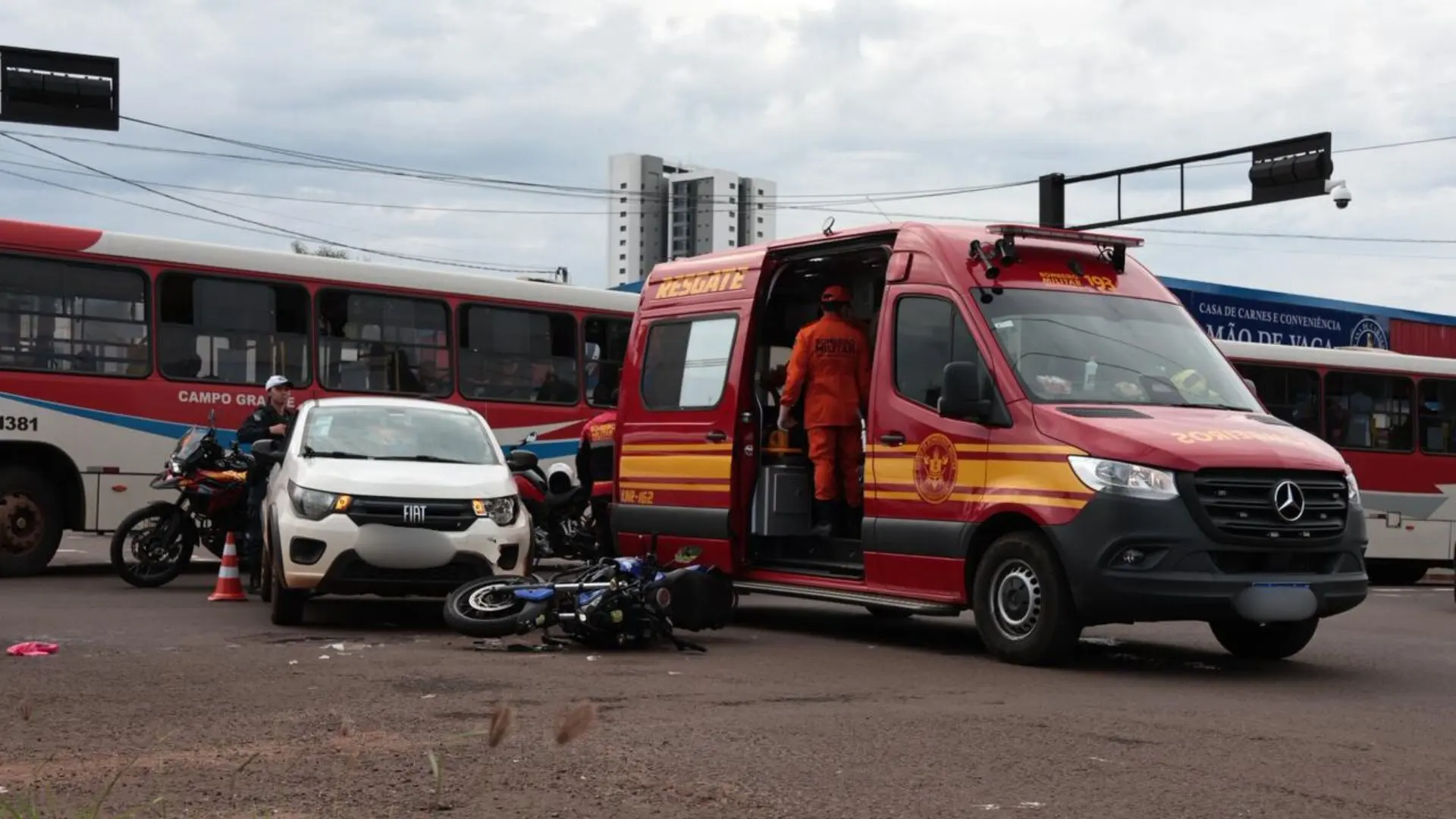 Uma colisão entre um carro e uma motocicleta mobilizou o Corpo de Bombeiros na manhã desta segunda-feira (23), no cruzamento das ruas 14 de Julho e Eça de Queirós, na região central de Campo Grande. O acidente envolveu dois motoristas de aplicativo e resultou no ferimento do motociclista e de sua passageira.