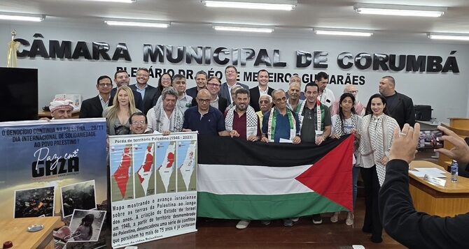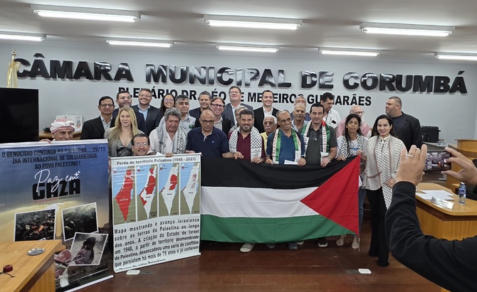 A Câmara Municipal de Corumbá celebrou, na noite de terça-feira (25), o Dia Internacional de Solidariedade ao Povo Palestino, em cerimônia que homenageou membros da comunidade palestino-brasileira radicada na cidade. O evento, promovido em parceria com a Sociedade Árabe Palestino-Brasileira de Corumbá e o Comitê 29 de Novembro, reforçou laços culturais e o histórico convívio harmonioso entre os povos na região pantaneira.