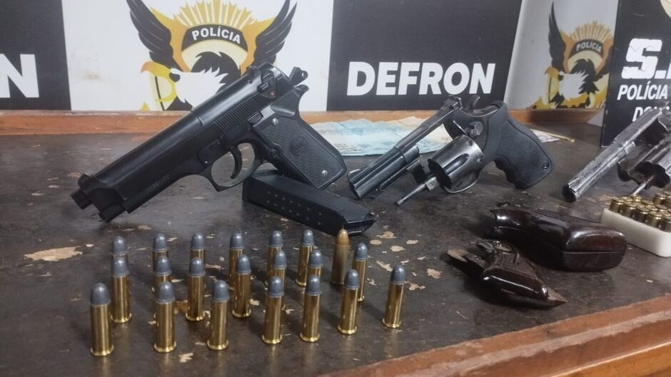 Na sequência, a equipe se deslocou para a casa de P.E.S., onde localizou outro revólver calibre .38, uma pistola Glock calibre 9mm com dois carregadores e 43 munições calibre 9mm, sendo 15 delas em um carregador inserido na arma, pronta para disparo. Cerca de R$ 4 mil em dinheiro também foram apreendidos.