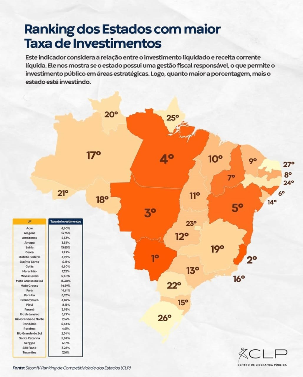 Mato Grosso do Sul conquistou o 1º lugar no Ranking de Competitividade dos Estados no indicador de investimento público, dentro do pilar Solidez Fiscal. O presidente da Assembleia Legislativa (ALEMS), Gerson Claro (PP), em nome dos 24 deputados da 12ª Legislatura, celebrou a conquista e destacou o papel do Legislativo na aprovação de propostas que promoveram o equilíbrio fiscal do estado.