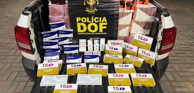 A abordagem ocorreu durante um bloqueio na MS-166, na área rural do município. Dentro da Saveiro, os militares encontraram conversores de TV, frascos de perfume, canetas de Mounjaro e outros medicamentos contrabandeados.