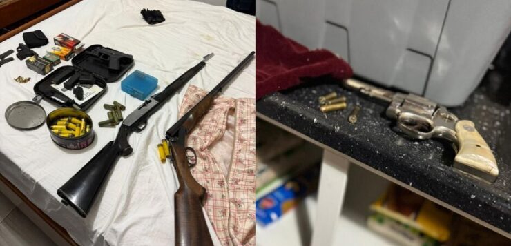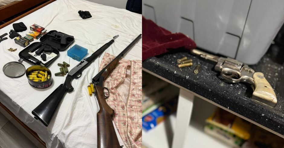 Durante a operação, a polícia encontrou um revólver calibre .38 e munições em uma das propriedades. Na outra, onde o suspeito foi localizado, foi descoberto um verdadeiro arsenal: 277 munições de calibres permitidos, além de várias armas de fogo. Entre elas, uma carabina .22 e uma espingarda .20 sem registro. Duas pistolas .380 tinham documentação, mas com os certificados vencidos.
