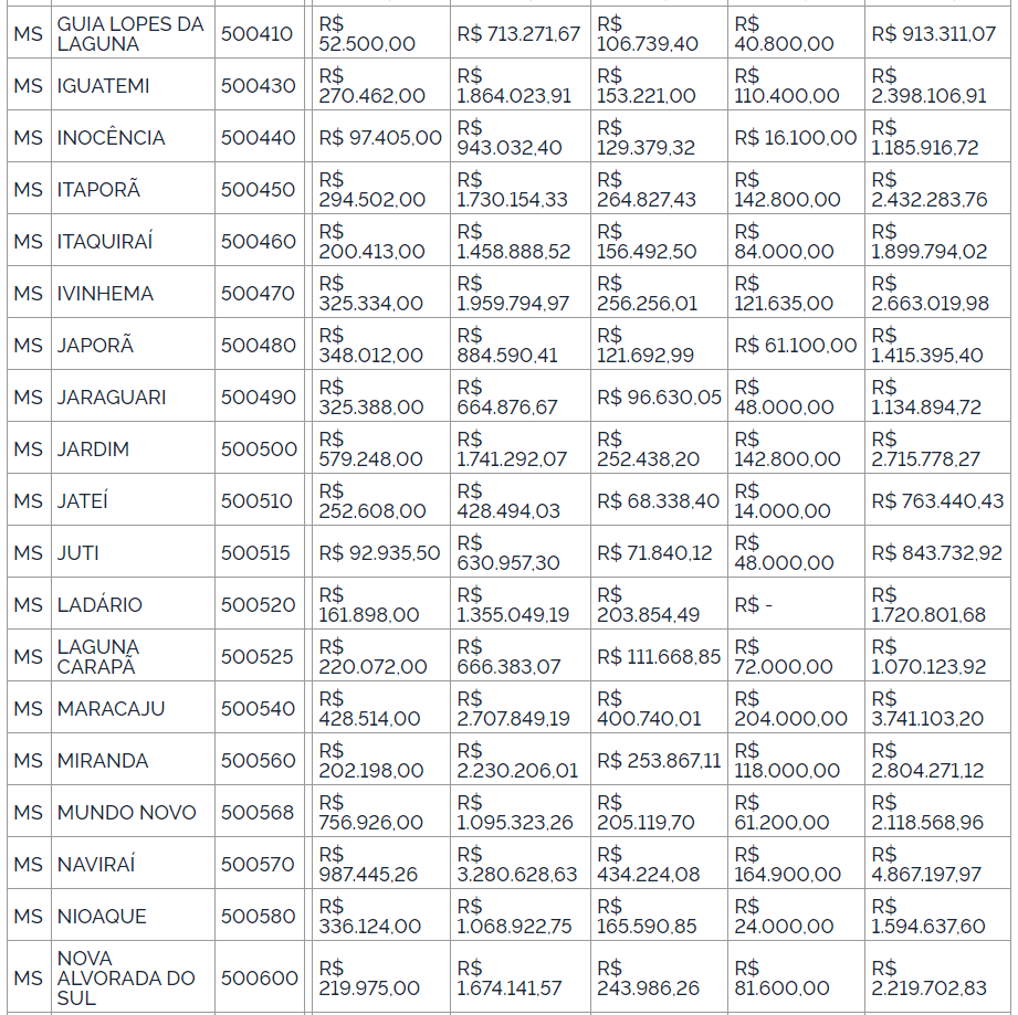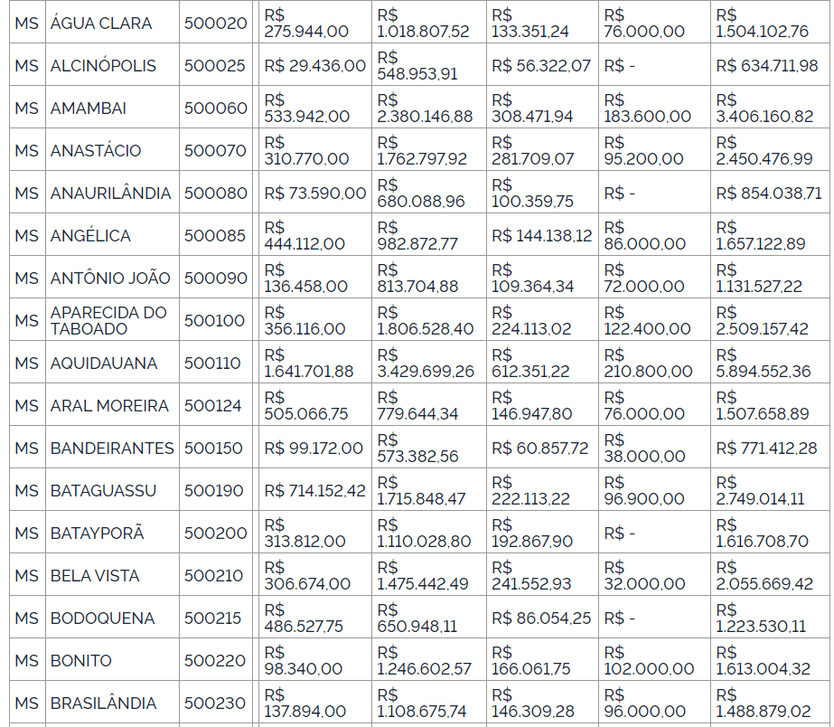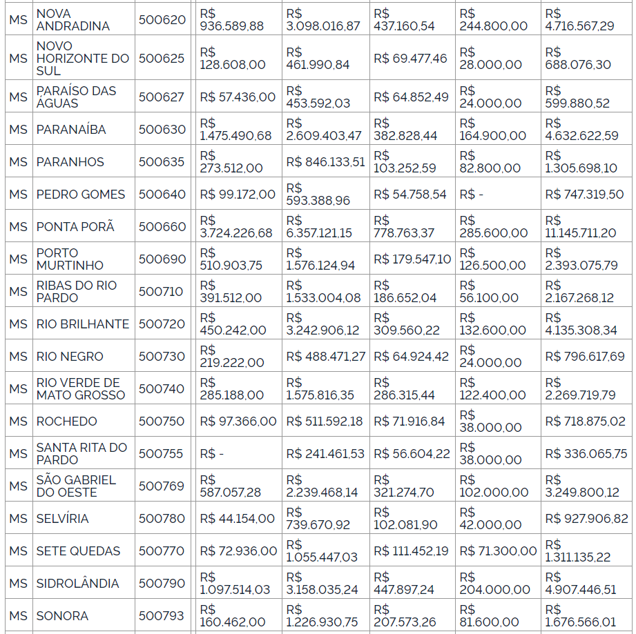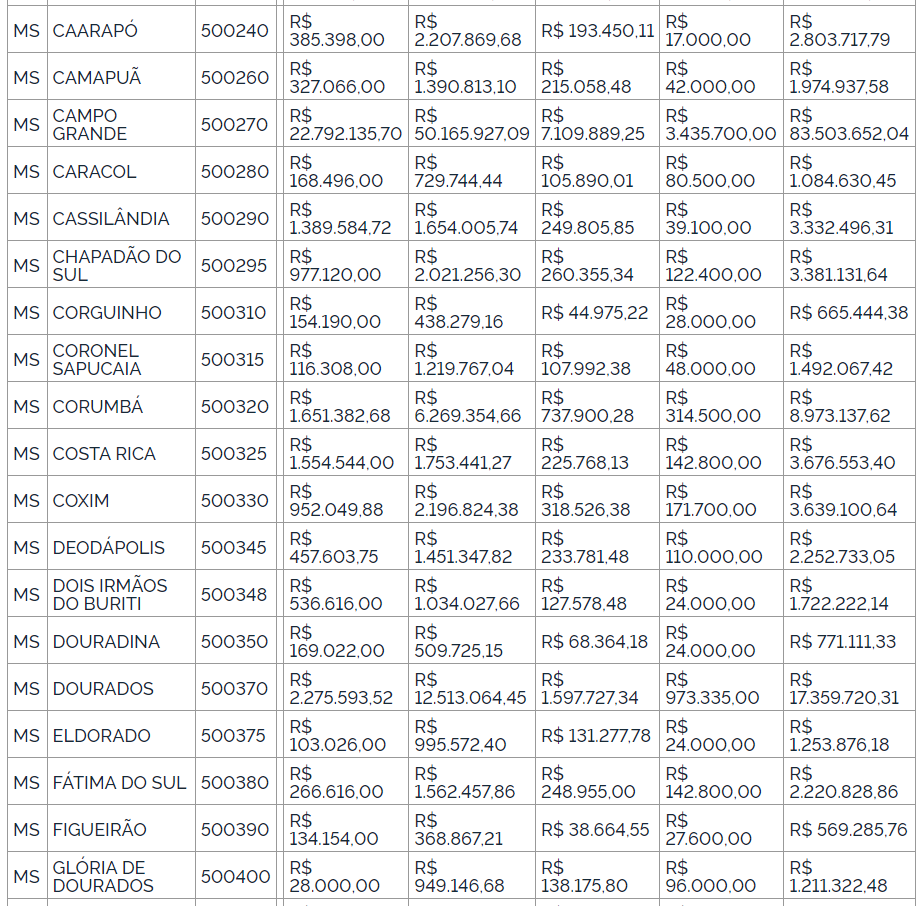 No caso do Mato Grosso do Sul, os montantes de referência destinados aos municípios totalizam R$ 280.392.591,51, enquanto os recursos de referência destinados ao cofinanciamento federal para o pagamento dos títulos dos agentes comunitários de saúde somam R$ 140.585. 180.