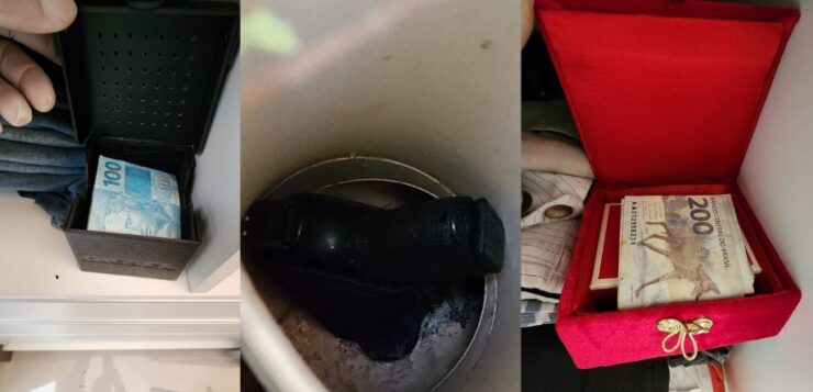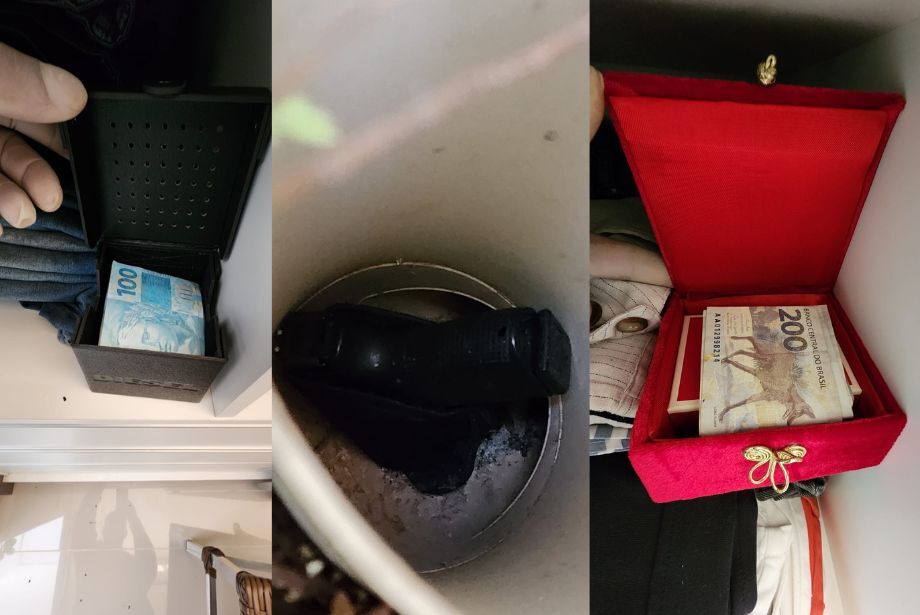 Durante as buscas, foram encontradas diversas quantias em dinheiro escondidas de diferentes maneiras — inclusive maços de notas de R$ 100 e R$ 200 — além de uma pistola apreendida. Imagens divulgadas pela PF mostram parte do material recolhido.