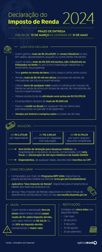 O prazo de entrega da declaração do Imposto de Renda começa às 8h da próxima sexta-feira e vai até as 23h59min59s de 31 de maio. Neste ano, o Fisco espera receber 43 milhões de declarações, contra 41.151.515 entregues em 2023.
