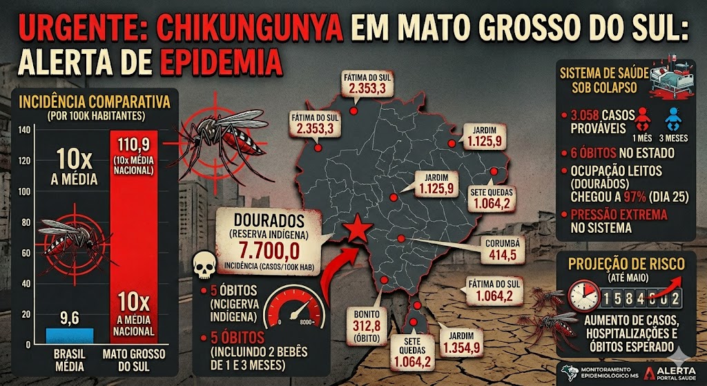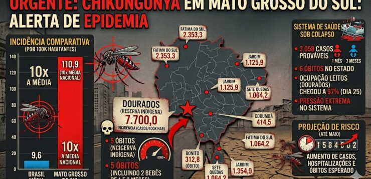 A tragédia é ainda mais profunda na Reserva Indígena de Dourados, onde cinco das seis vítimas fatais foram registradas, incluindo dois bebês de apenas um e três meses de vida. Nestas comunidades, a taxa de incidência ultrapassa os 7,7 mil casos por 100 mil habitantes, uma realidade catastrófica. Cidades como Fátima do Sul, Jardim e Sete Quedas também apresentam números impressionantes, com incidência superior a mil casos, evidenciando que o controle da doença fugiu da normalidade e exige medidas urgentes.